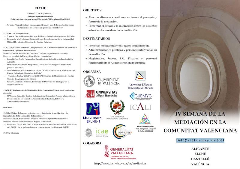 La semana del 17 al 21 de mayo de 2021 se celebrará la IV SEMANA DE LA MEDIACION EN LA COMUNITAT VALENCIANA, organizada por los Colegios de Abogados de Alicante, Elche, Castellón y Valencia.
